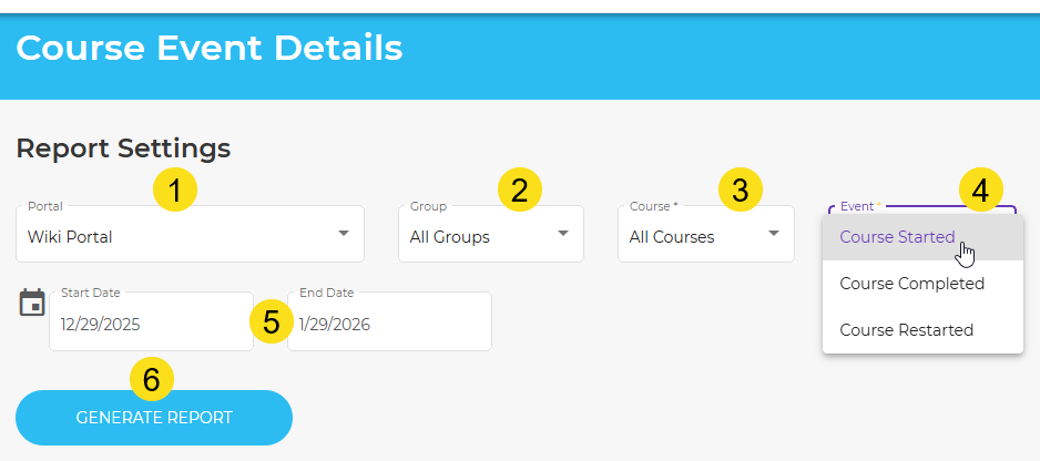 This event is when a member begins a course; this event is logged when the member has clicked the "Start Now" button.