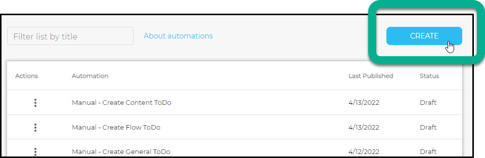 On the main automations page, you can see a table listing any automations that currently exist for this portal. We are going to make a new one for the Goal Check-In Flow template—select CREATE above the right corner of the table.