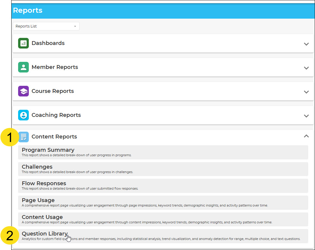 The Question Library Report provides administrators with insights into how questions within the Question Library are being used across Challenges, Courses, and Trackers. This report helps identify which questions are most active, where they appear, and how they contribute to engagement and outcomes.